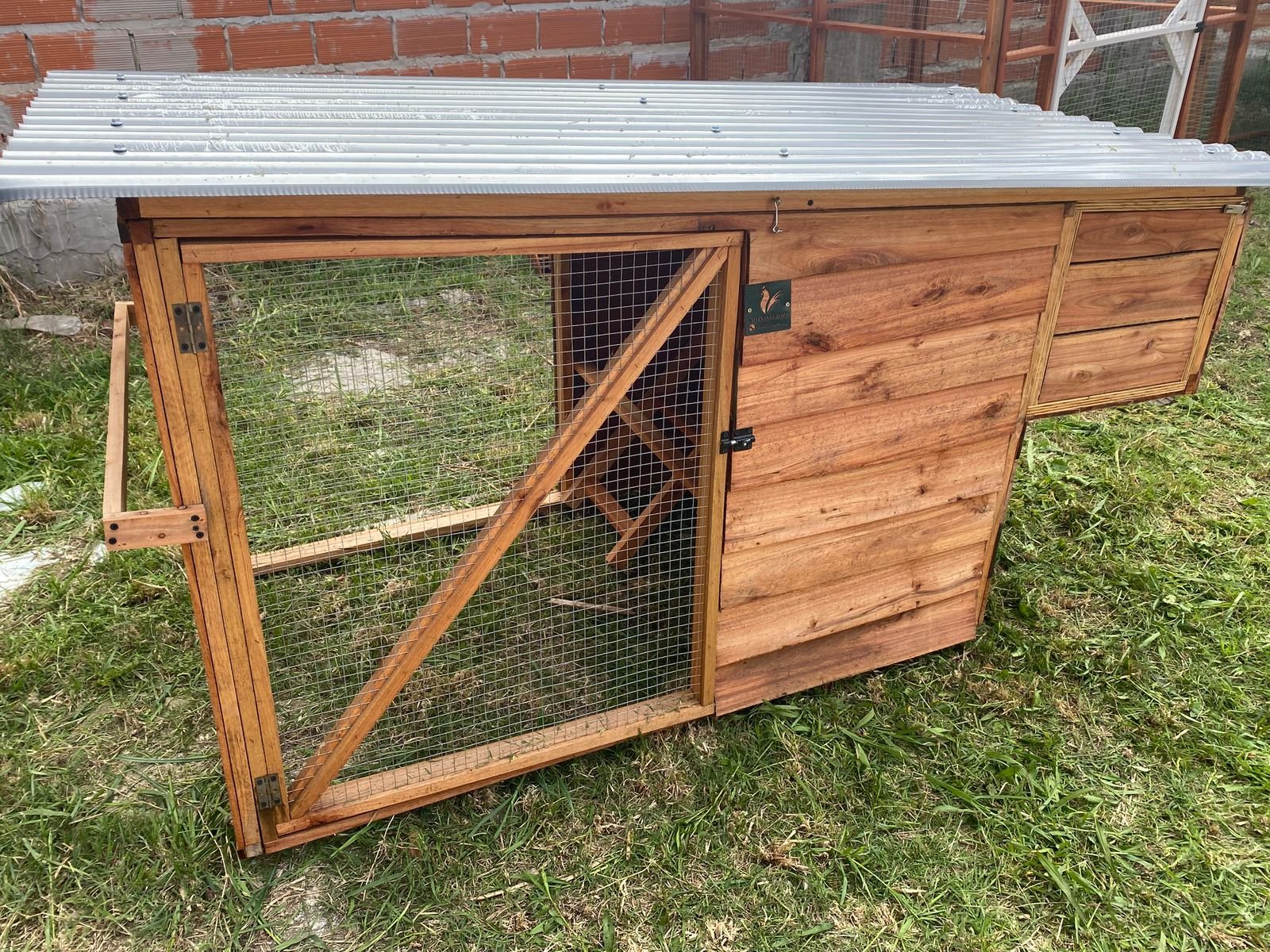 Con una longitud total de 2 metros, 1 metro de ancho y 1 metro de altura, este modelo integra un refugio elevado para descanso y postura junto a un corral delantero de pastoreo directo sobre el suelo, promoviendo el comportamiento natural de las aves.
