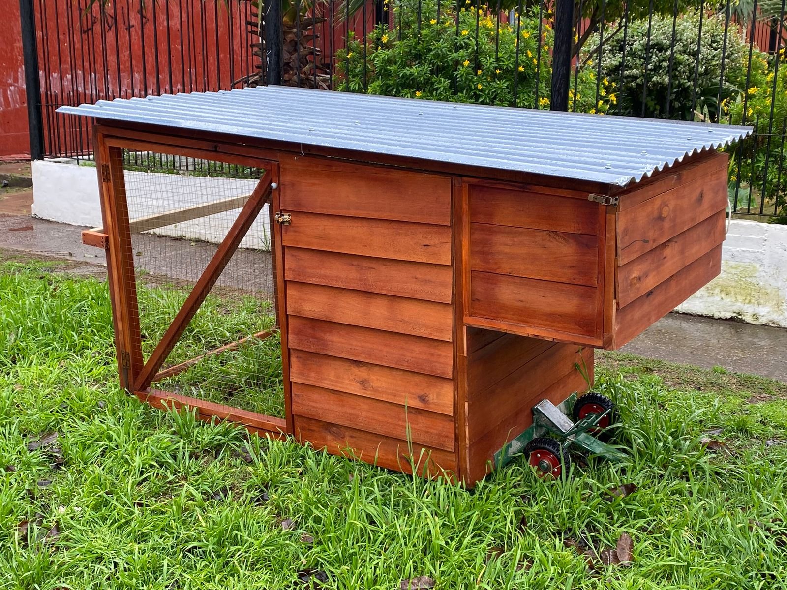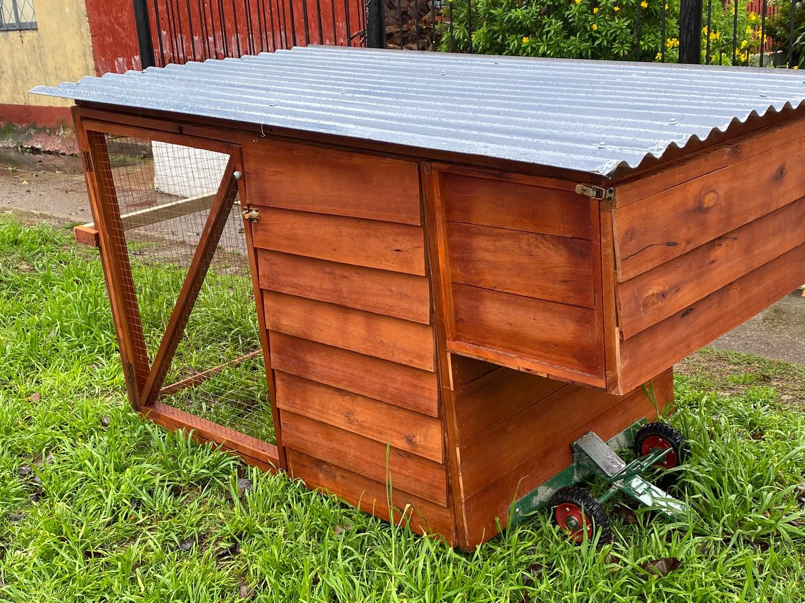 Incluye: refugio elevado, corral abierto, nidal externo y sistema mecánico de movilidad.