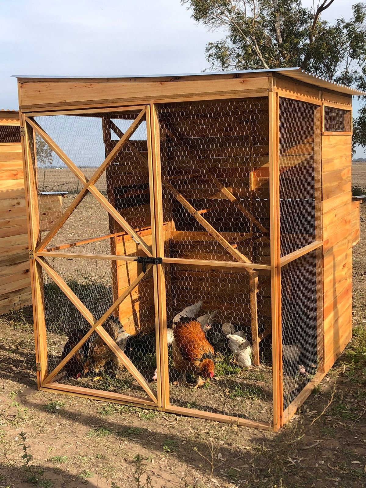 Una mitad del gallinero se encuentra totalmente cubierta con madera y techo de chapa, brindando protección contra lluvia, viento y sol.
