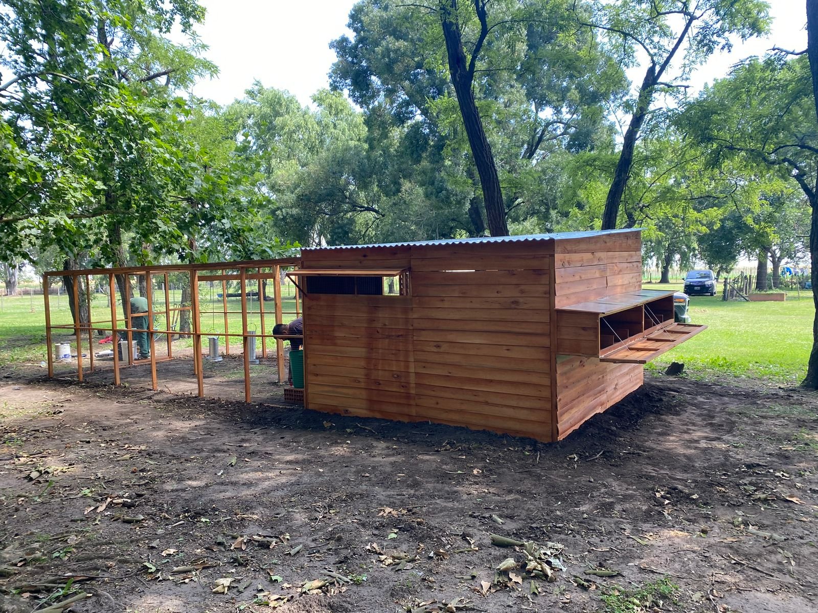 Su diseño combina un área interior protegida y un amplio patio exterior, permitiendo que las gallinas tengan refugio para descansar y poner huevos, y al mismo tiempo un gran espacio para moverse libremente durante el día.